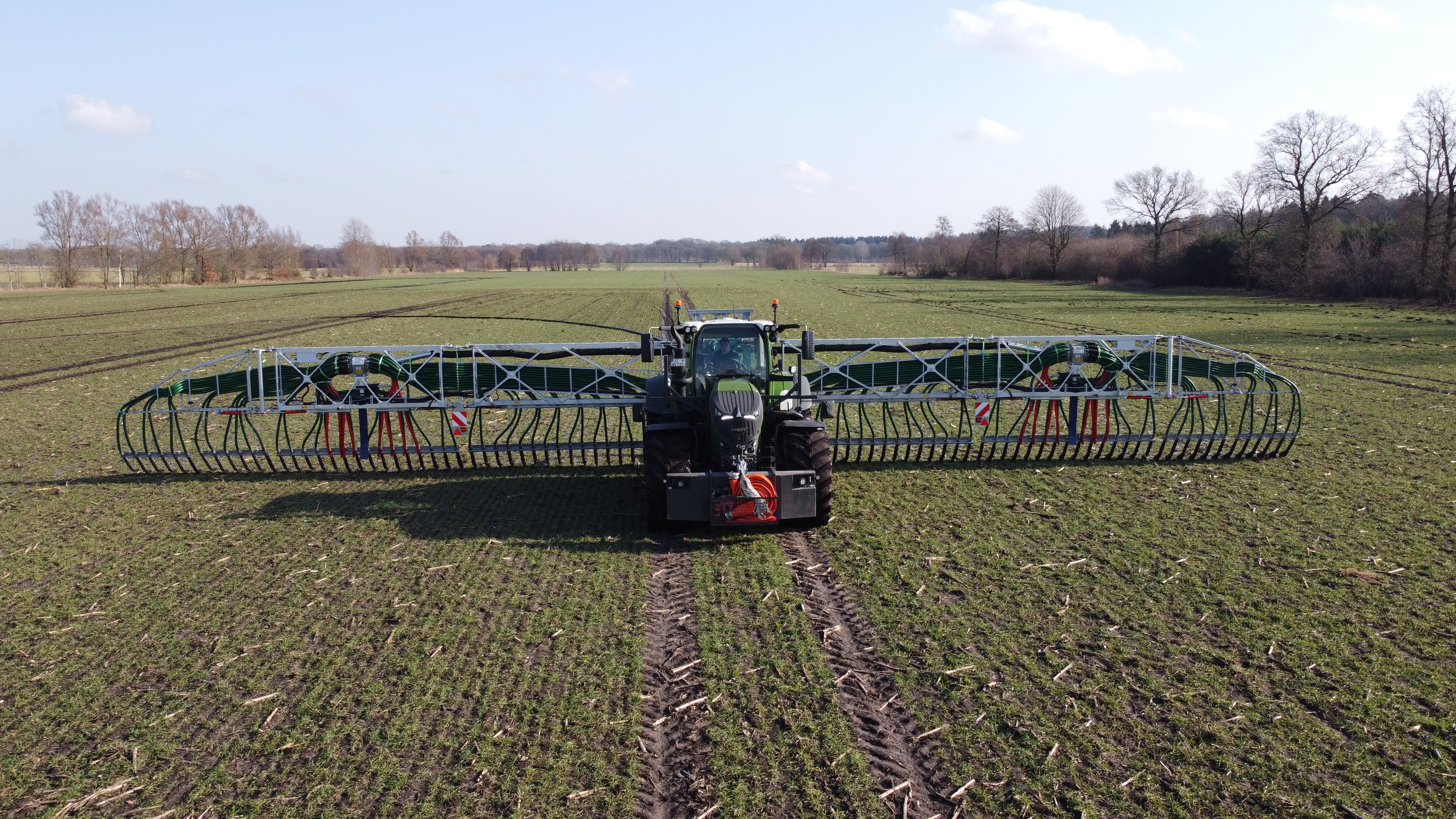 Aktuell sind wir mit der Ausbringung von Gülle im Einsatz. Unser neues 24m Vogelsang “Verschlauchungs” Gestänge hat sich gut bewehrt. In den meisten Fällen konnten wir mit diesem Gestänge die Gülle ausbringen. Mit dem Gestänge können wir Arbeitsbreiten von 24,21,18,15,12m fahren. Für die nassen Moorflächen haben wir alternativ auch mit dem 15m Bomech Gestänge ausgebracht. Auch mit unserem Samson PG21 sind wir fleißig am Fahren.